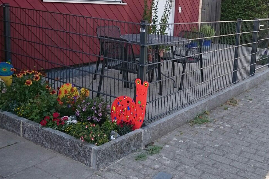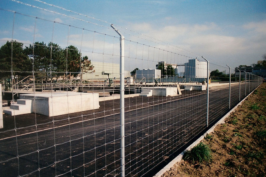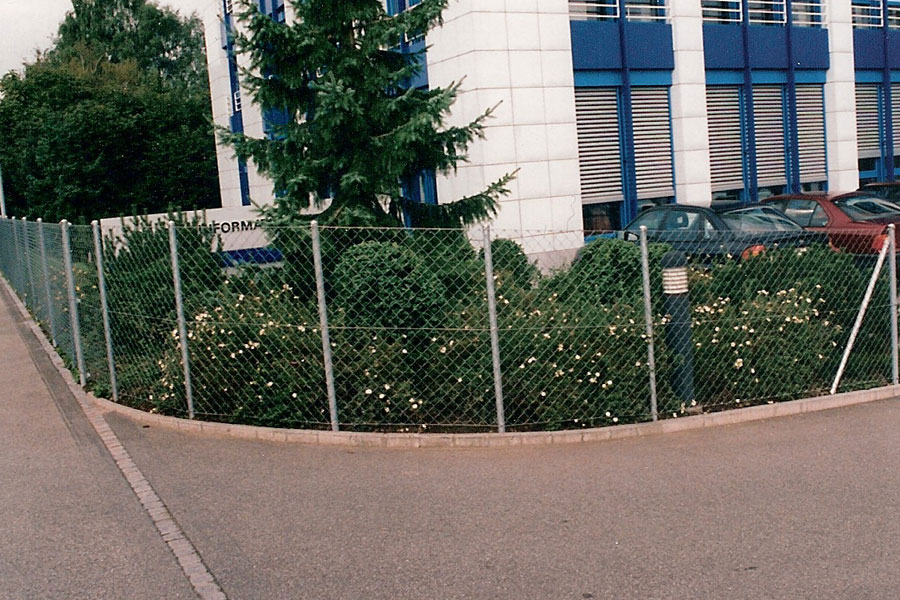 Objektschutz mit Diagonaldrahtgeflecht, Rohrpfosten und Streben. Material verzinkt. Rohrdeckel und Strebenspitzen aus Alu. Sicherheitsschloss.